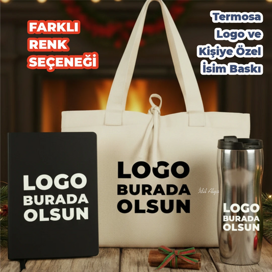 Yılbaşı Ofis Hediye Seti – Logolu Termos, Kanvas Defter & Bez Çanta