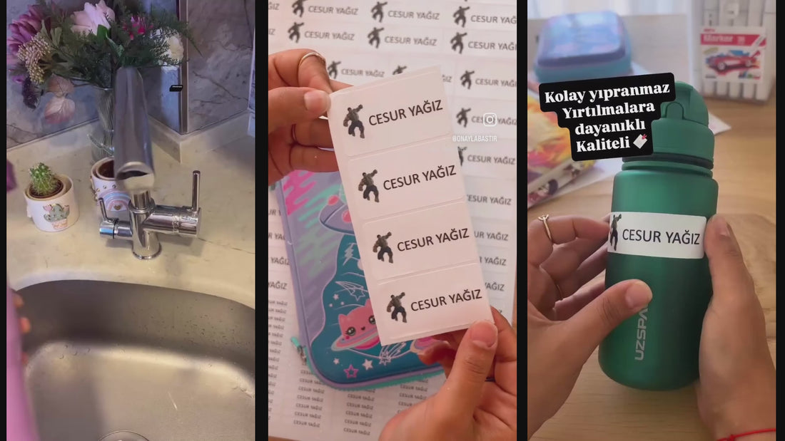 Çocuğunuzun defter, kitap, matara, kalem kutusu ve tüm okul eşyalarını kaybolmaya karşı koruyan; üzerine istediğiniz İsim–Soy isim ve ikon (ör. futbol topu, unicorn, uzay roketi vb.) basılabilen 350 adetlik oval kesim kuşe etiket setidir.